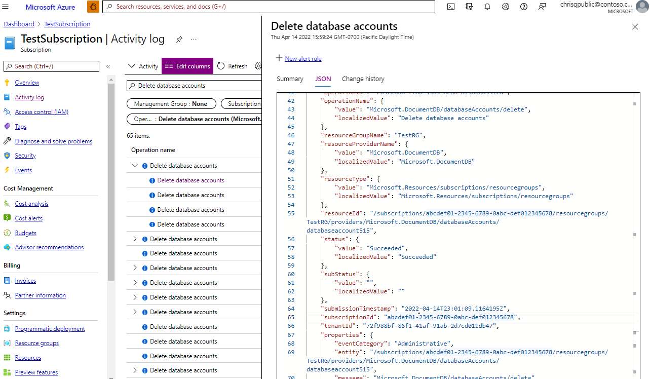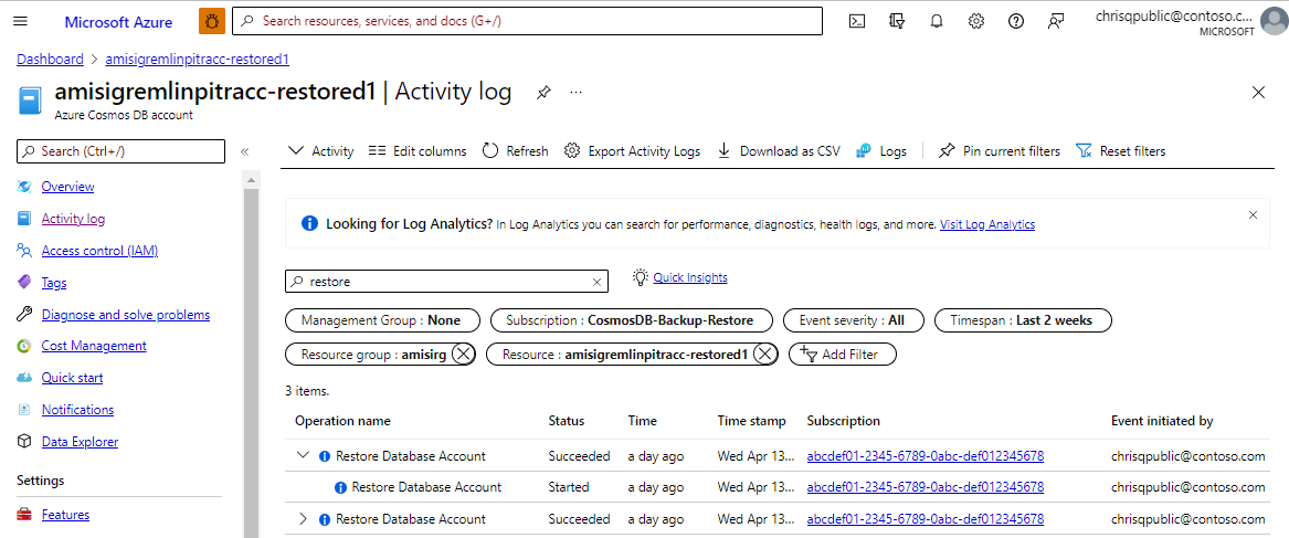 Azure Cosmos DB provides you with a list of all point-in-time restores for continuous mode that were performed on an Azure Cosmos DB account using activity logs. Activity logs can be viewed for any Azure Cosmos DB account from the Activity Logs page in the Azure portal. The activity log shows all the operations that were triggered on the specific account. When a point-in-time restore is triggered, it shows up as Restore Database Account operation on the source account as well as the target account. The activity log for the source account can be used to audit restore events, and the activity logs on the target account can be used to get the updates about the progress of the restore.
