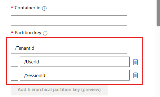 /TenantIdas an example here. You can specify any key for the first level when you implement hierarchical partition keys on your own containers.Select Add hierarchical partition key twice.