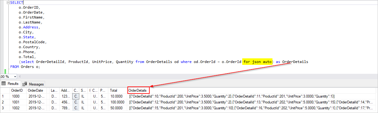(select OrderDetailId, ProductId, UnitPrice, Quantity from OrderDetails od where od.OrderId = o.OrderId for json auto) as OrderDetails