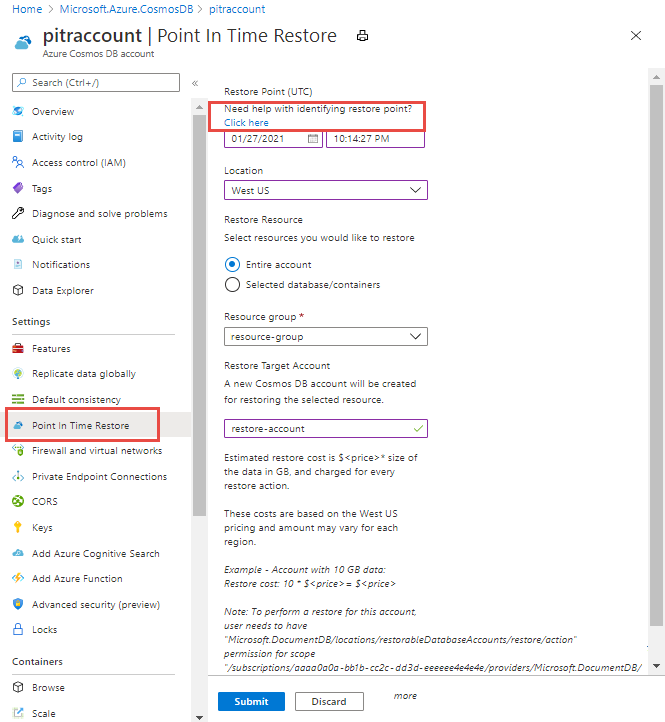 When filling out the restore point time in the Azure portal, if you need help with identifying restore point, select the Click here link, it takes you to the event feed page. The event feed provides a full fidelity list of create, replace, delete events on databases and containers of the source account.