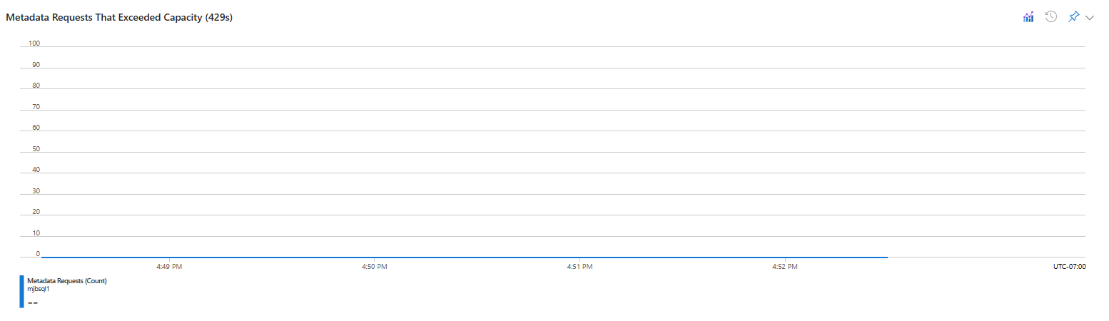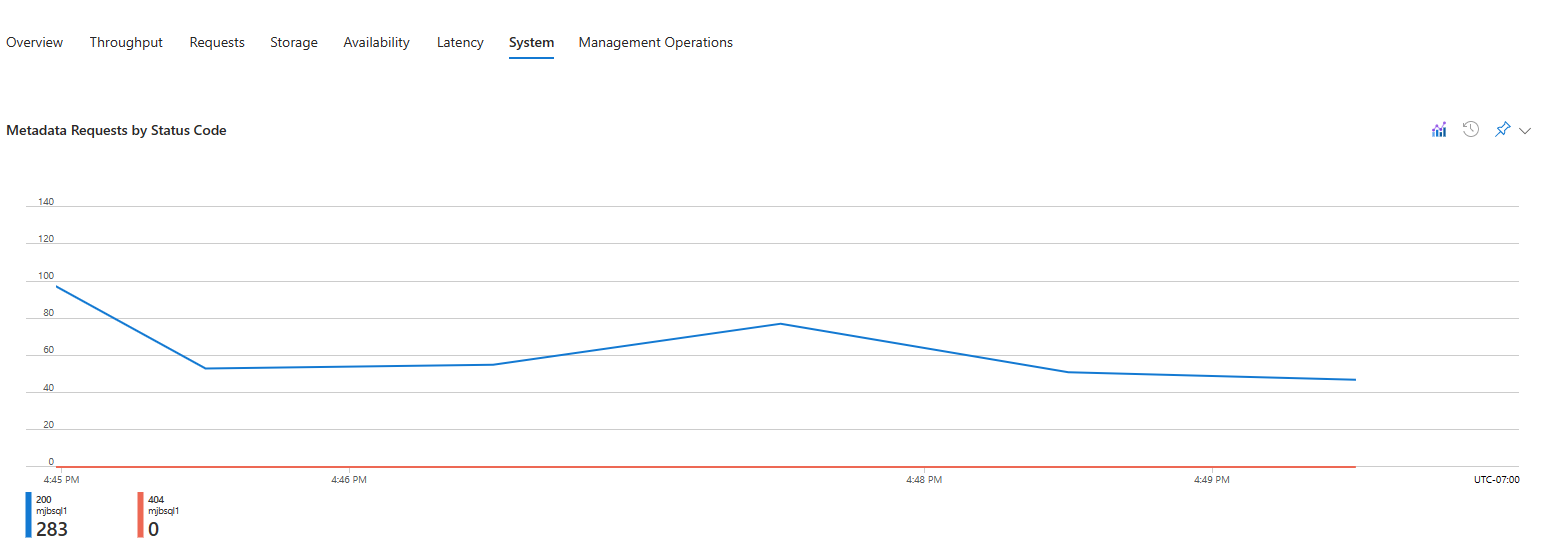 Screenshot of Metrics pane, highlighting the metadata requests for an account and time granularity of 5 minutes.