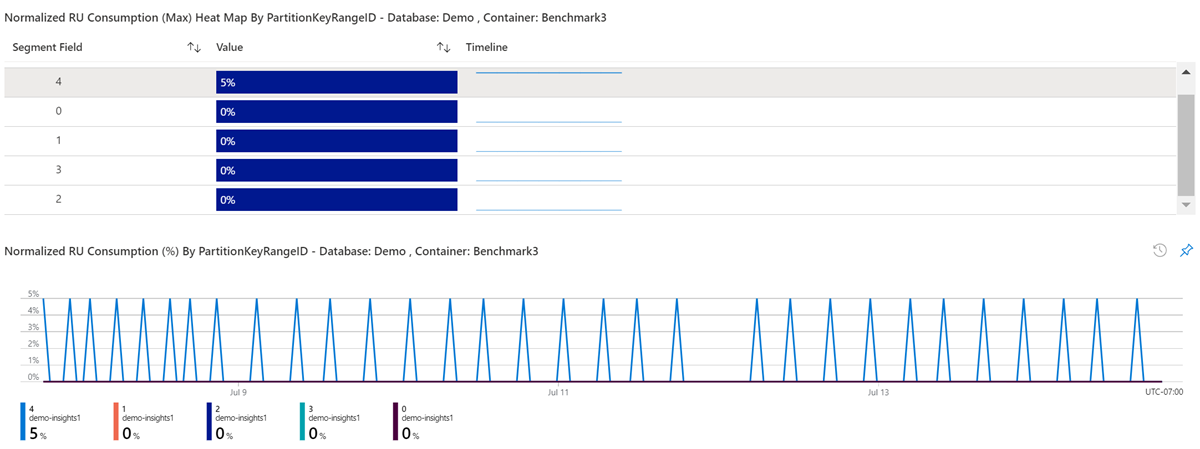 With the help of this chart, you can identify if there's a hot partition. The PartitionKeyRangeIDs corresponds to physical partitions. The Normalized RU Consumption metric is a value between 0% and 100% that helps measure the utilization of provisioned throughput on a database or container. An uneven throughput distribution might cause hot partitions, which can result in throttled requests and might require repartitioning. After identifying which partition key is causing the skew in distribution, you might have to repartition your container with a more distributed partition key. For more information about partitioning in Azure Cosmos DB, see Partitioning and horizontal scaling in Azure Cosmos DB.