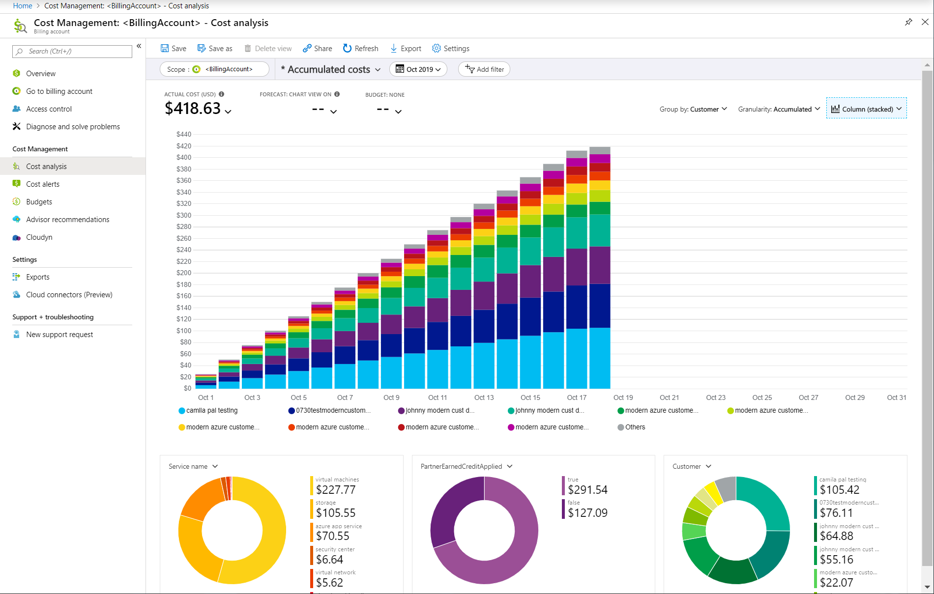 Partners who have billing access can use cost analysis to view and examine billed costs across customers, either for individual customers or specific invoices. In cost analysis, you can also save views.