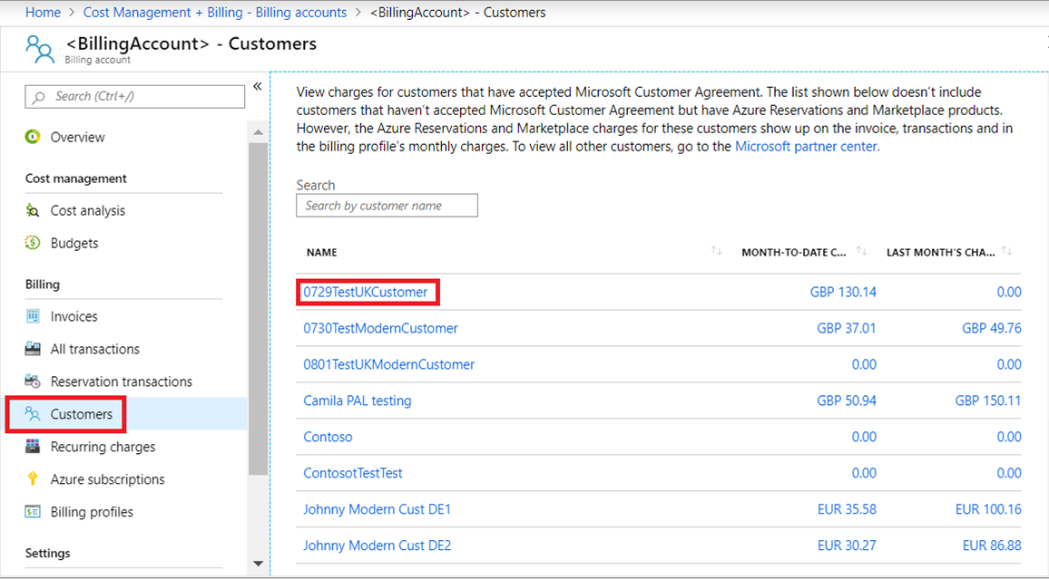 In the Azure portal, sign in to the partner tenant and select Cost Management + Billing. Select the relevant billing scope in the Billing Scope area, and then select Customers. The list of customers is associated with the billing account. If you mistakenly sign in to the customer tenant, you don't see the Customers list.