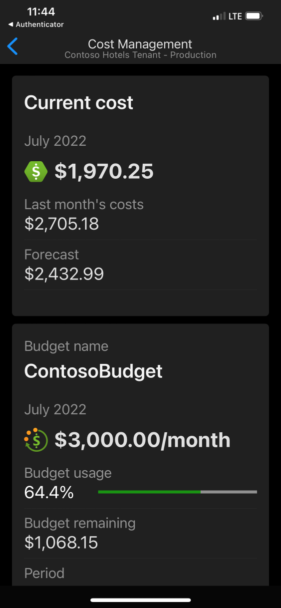 You can also use the Azure app to track the status of subscription or resource group cost. You can see your current cost, last month’s cost, forecasted cost, and view your budget usage.