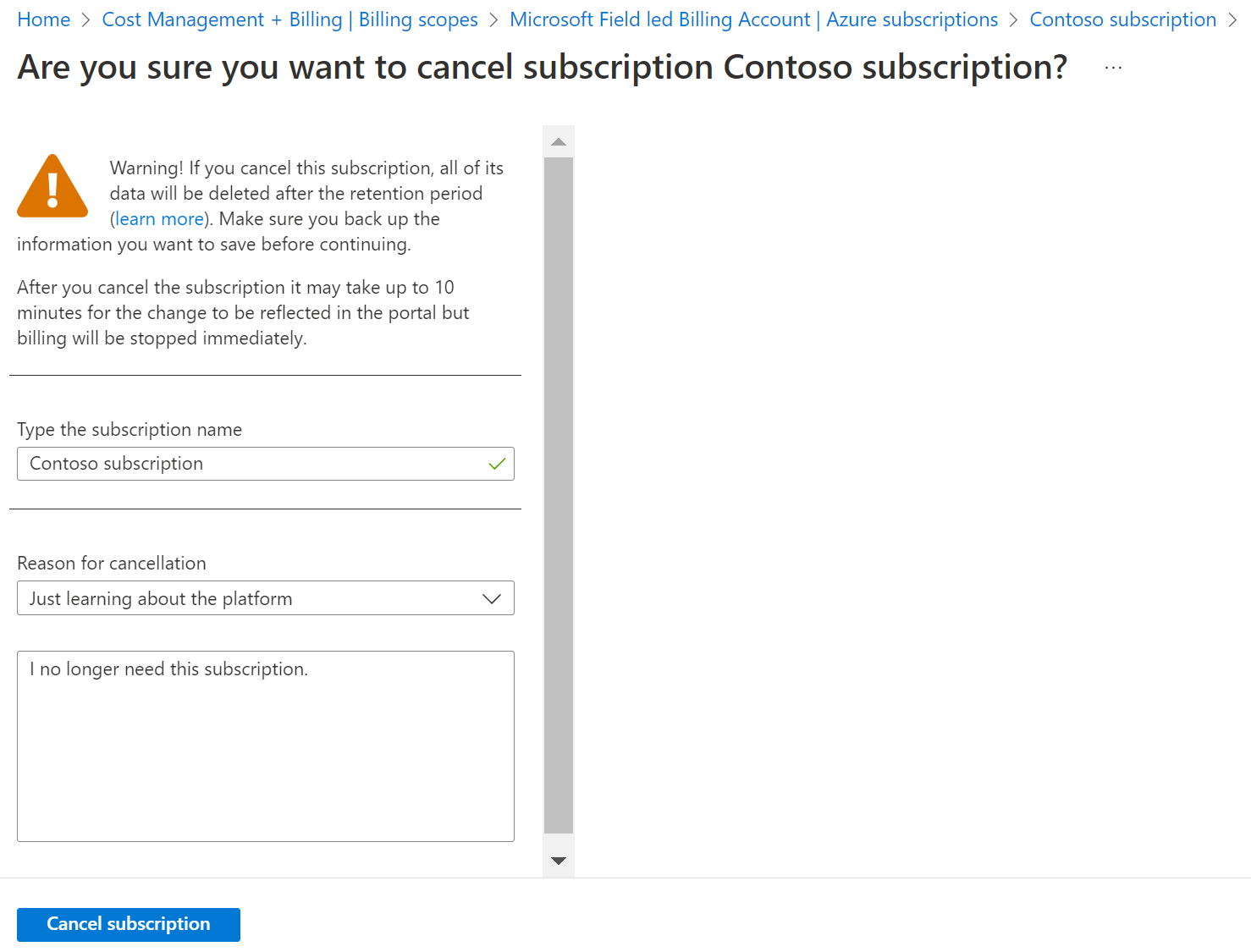 After you cancel a subscription, your billing stops immediately. You can delete your subscription directly using the Azure portal three days after you cancel it, using the Delete subscription option after it becomes available. When your subscription is canceled, Microsoft waits 30 to 90 days before permanently deleting your data in case you need to access it or recover your data. We don't charge you for retaining the data. For more information, see Microsoft Trust Center - How we manage your data.