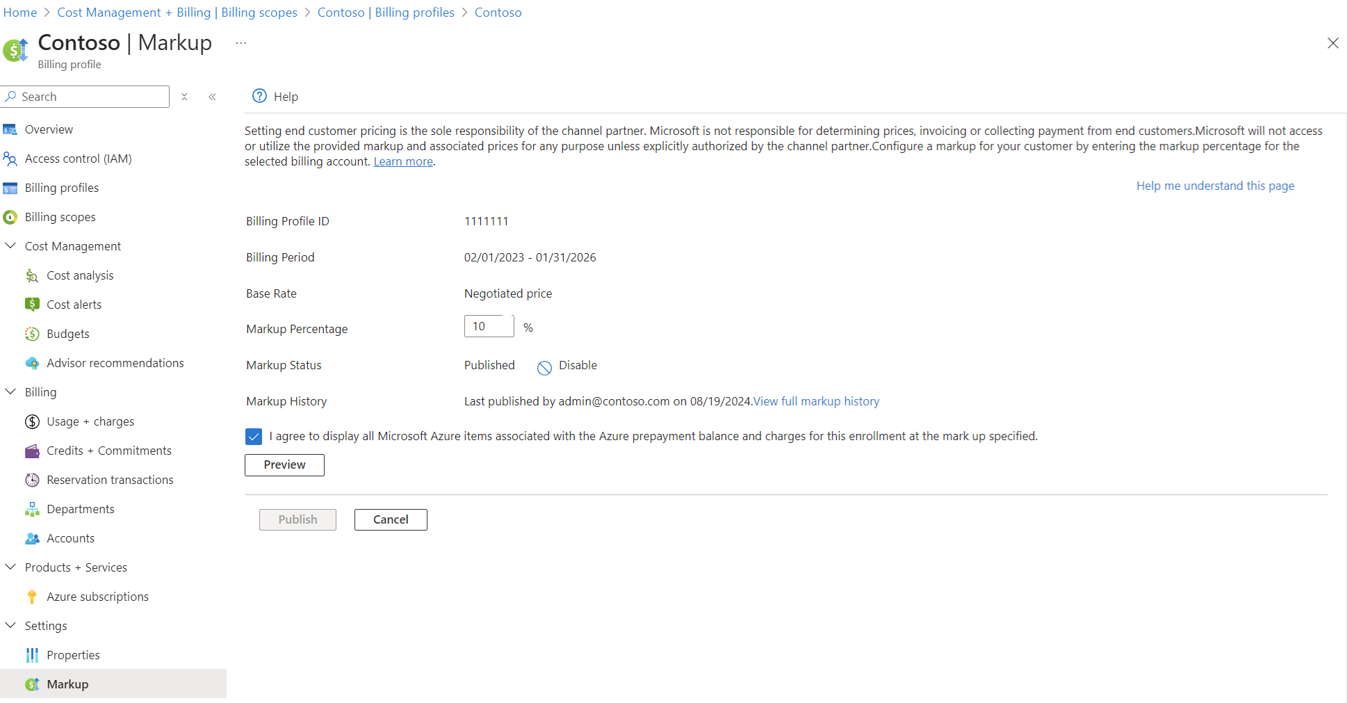 Markup allows partner administrators to add a percentage markup to their indirect enterprise agreements. Percentage markup applies to all Microsoft first party service information in the Azure portal such as: meter rates, Azure Prepayment, and orders. After the partner publishes the markup, the customer sees Azure costs in the Azure portal. For example, usage summary, price lists, and downloaded usage reports. Percentage markup isn't applied to Azure Marketplace.