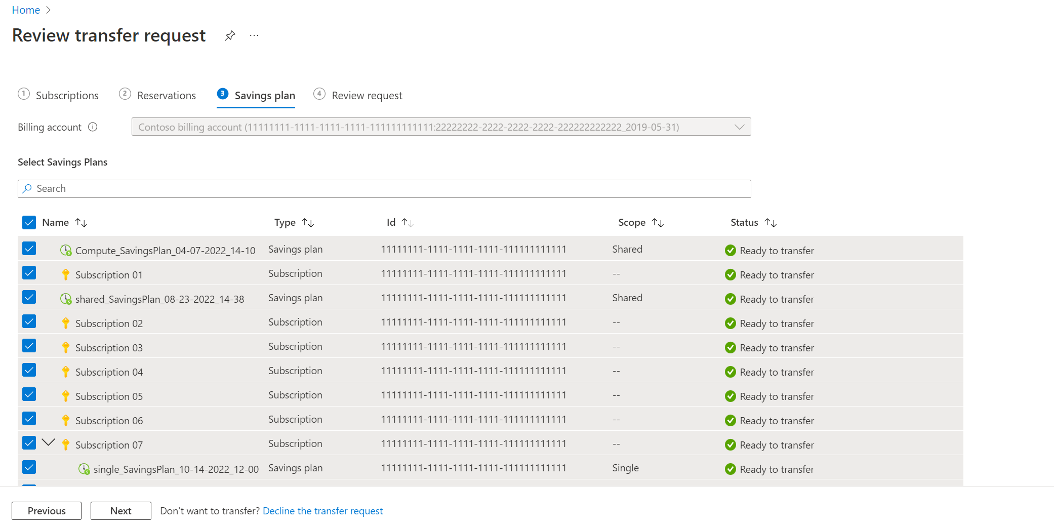 If there are savings plans available to transfer, select the Savings plan tab, and then select them. If you don't want to transfer savings plans, make sure that no savings plans are selected.