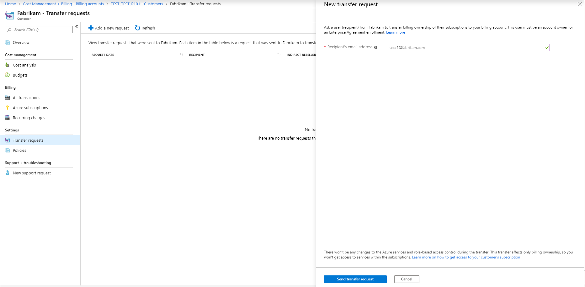 - Enter the email address of the user in the customer organization who will accept the transfer request. Select Send transfer request.