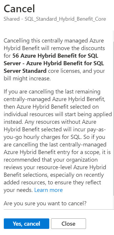 Review your license situation before you cancel your license assignments. When you cancel a license assignment, you no longer receive discounts for them. So, your Azure bill might increase. If you cancel the last remaining license assignment, Azure Hybrid Benefit management reverts to the individual resource level.