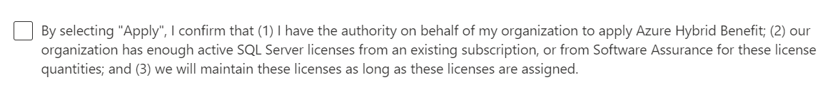 Select the By selecting "Apply" attestation option to confirm that you have authority to apply Azure Hybrid Benefit, enough SQL Server licenses, and that you maintain the licenses as long as they're assigned.