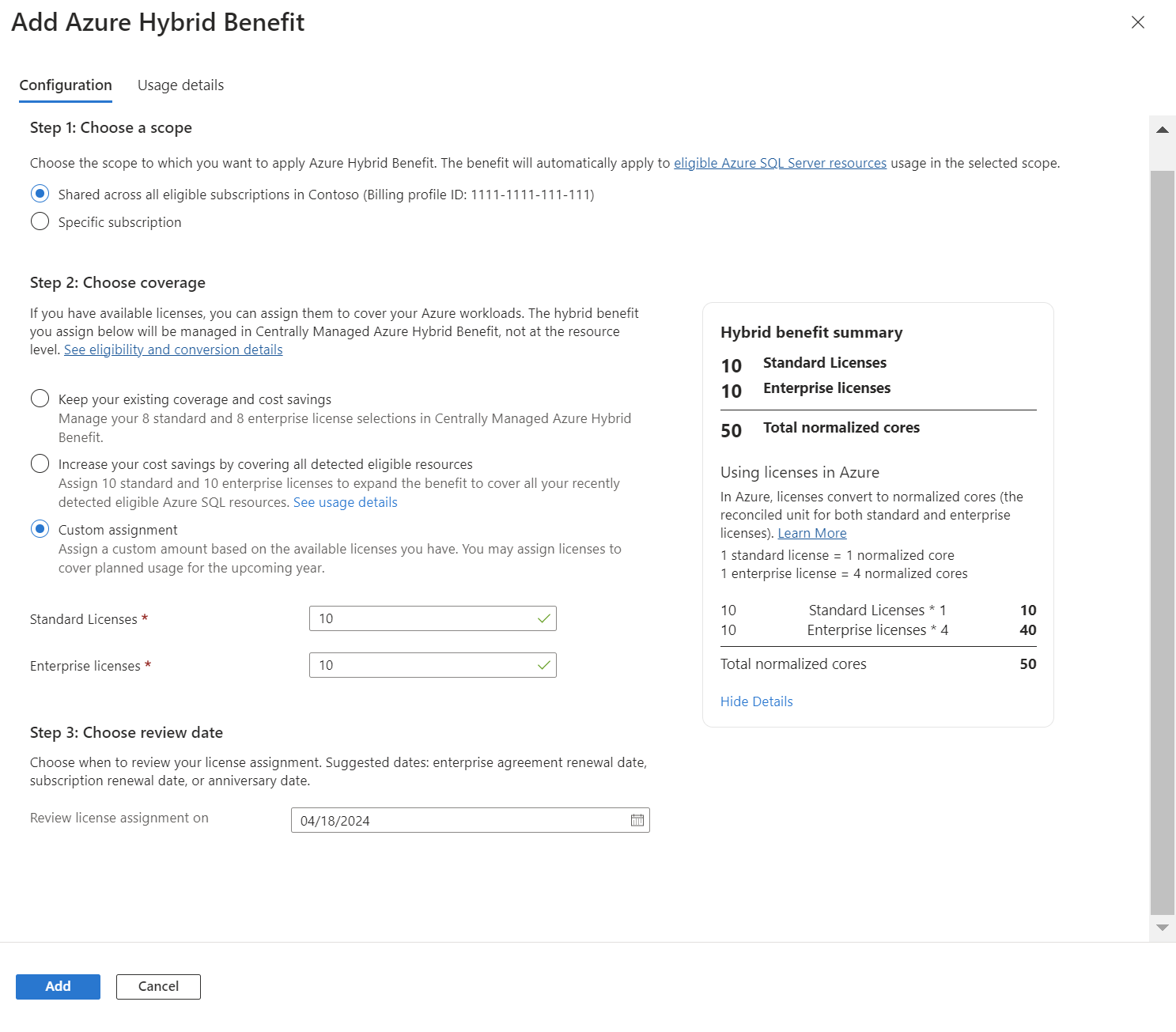 If you don't see the page, and instead see the messageYou are not the Billing Admin on the selected billing scopethen you don't have the required permission to assign a license. If so, you need to get the required permission. For more information, see Prerequisites.Choose the scope and coverage option for the number of qualifying licenses that you want to assign.
