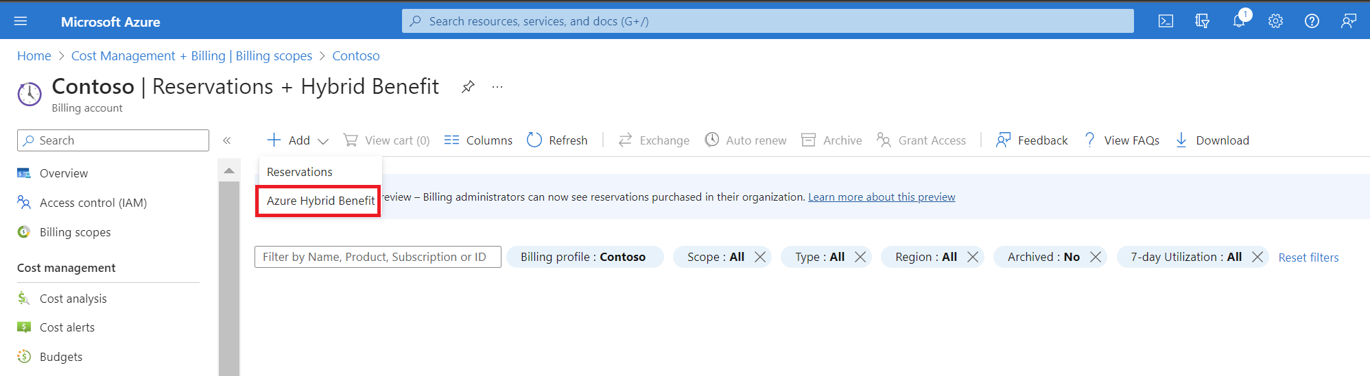 In the following procedure, you navigate from Cost Management + Billing to Reservations + Hybrid Benefit. Don't navigate to Reservations from the Azure home page. By doing so, you don't have the necessary scope to view the license assignment experience.