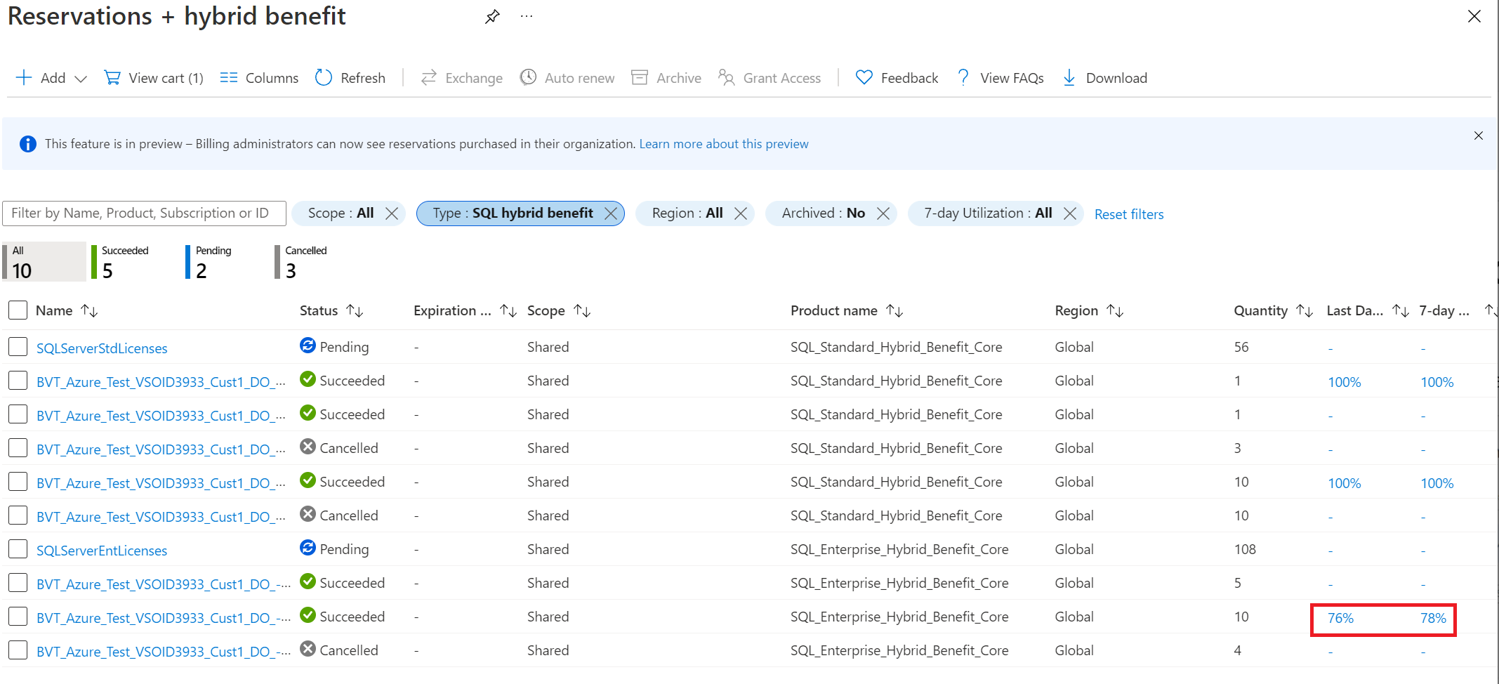A list of all reservations and license assignments is shown. If you want to filter the results to only license assignments, set a filter for SQL hybrid benefit.