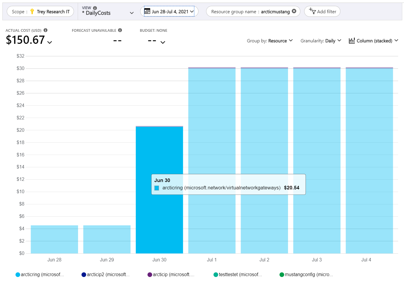 Let's continue drilling into the data to find out more about the cost increase. Select the item that increased in cost (articmustang) to automatically set a filter for the resource group name. Then, change the Group by list to Resource. Then set the date range to a smaller period. For example, June 28 to July 4. In the following example image, the increase in cost is clearly shown. The type of resource is shown as microsoft.network/virtualnetworkgateways.