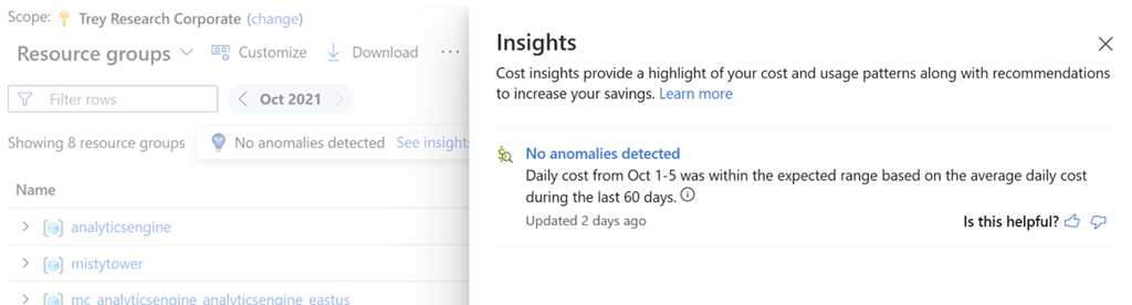 Whether you know if you have any existing cost anomalies or not, Cost Analysis informs you if it finds anything unusual as part of Insights. If not, Cost Analysis shows No anomalies detected.