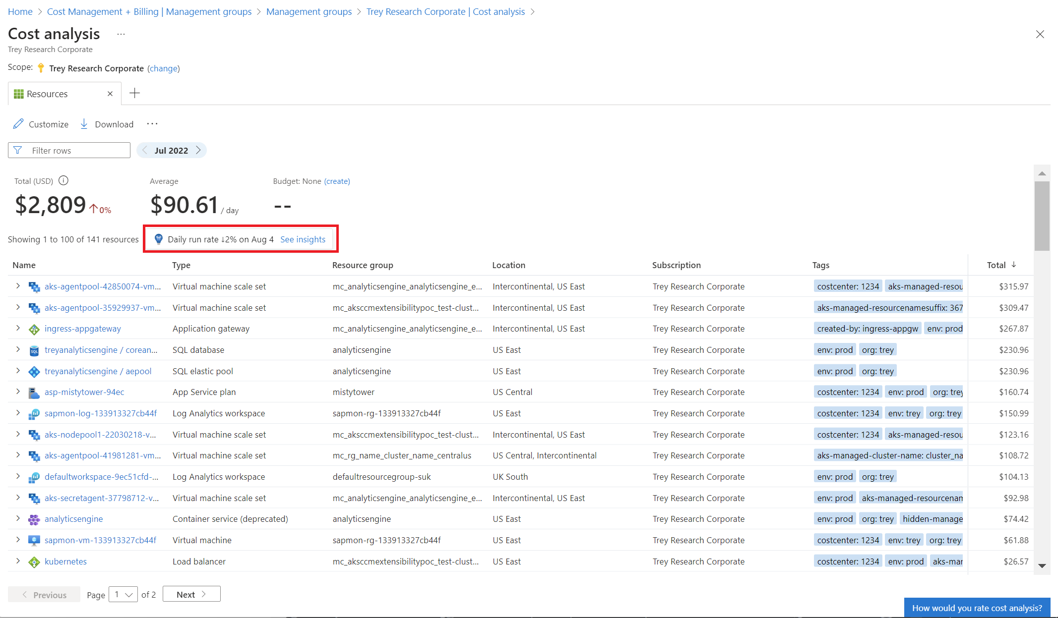 To drill into the underlying data for something that changed, select the insight link. It opens a view in the classic Cost Analysis where you can review your daily usage by resource group for the time range that was evaluated.