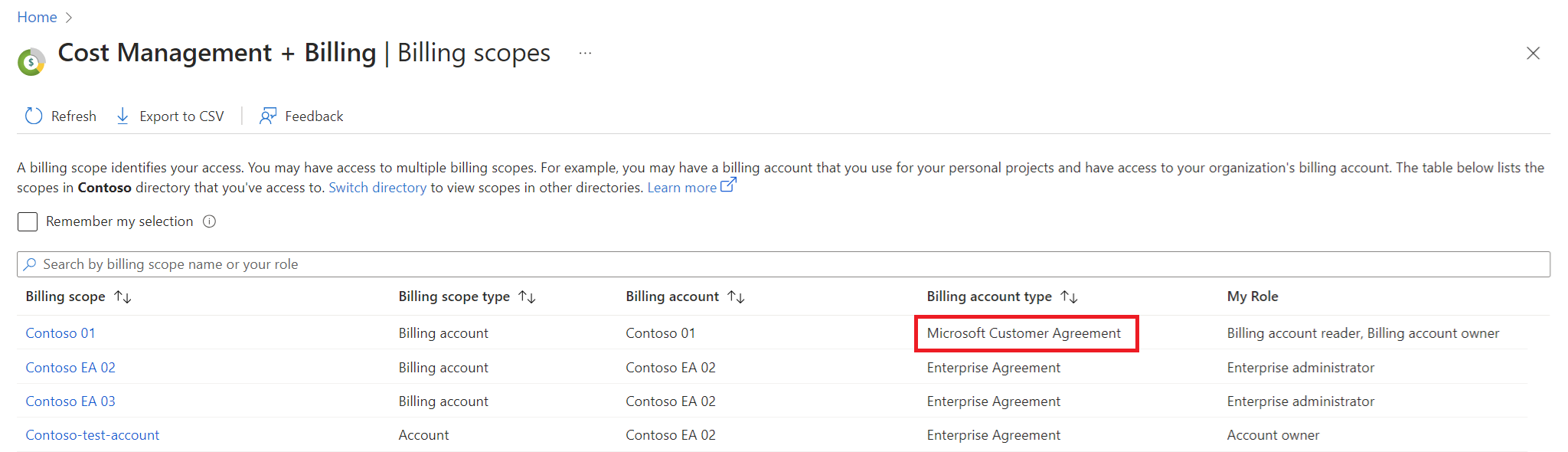 If you have access to multiple billing scopes, check the type in the billing account column. You have access to a billing account for a Microsoft Customer Agreement if the billing account type for any of the scopes is Microsoft Customer Agreement.