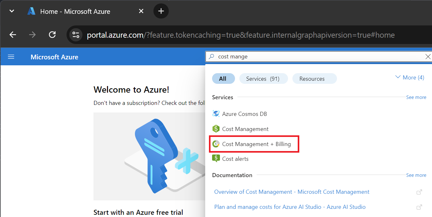 - Go to the Azure portal to check for billing account access. Search for and select Cost Management + Billing.