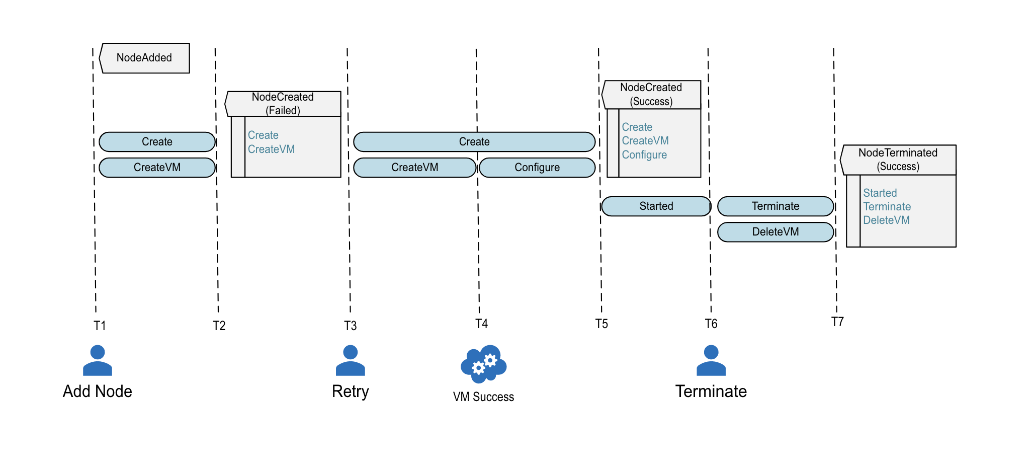 NodeCreatedis sent with a status of Succeeded and the following timing information:Create: (T5-T3)CreateVM: (T4-T3)Configure: (T5-T4)