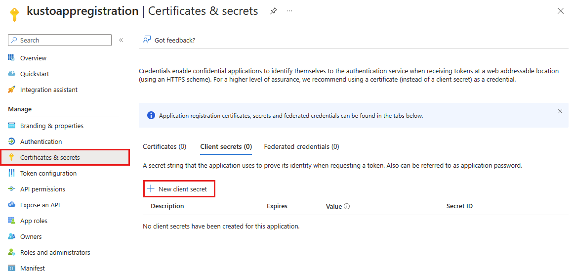 In the Certificates & secrets blade, select New client secret.