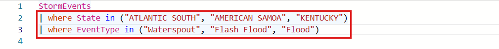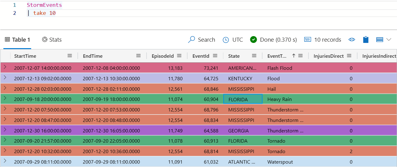 StormEvents | take 10Select the cells with content for which you want to create a query filter. To select multiple cells, click and drag your mouse over the cells you want to select, or hold down the "Ctrl" key while clicking on each cell. For example, select multiple cells from the