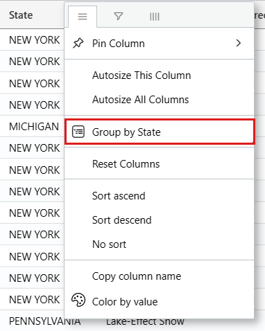 StormEvents | where EventType == "Lake-Effect Snow"Mouse-over the State column, select the menu, and select Group by State.