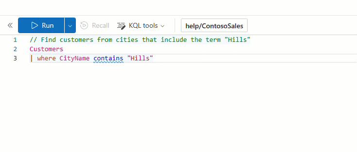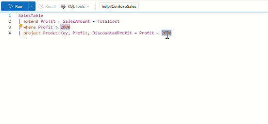The query editor has built-in KQL Intellisense that offers contextual suggestions for functions and operators, and autocomplete that completes your queries to save you time and effort.