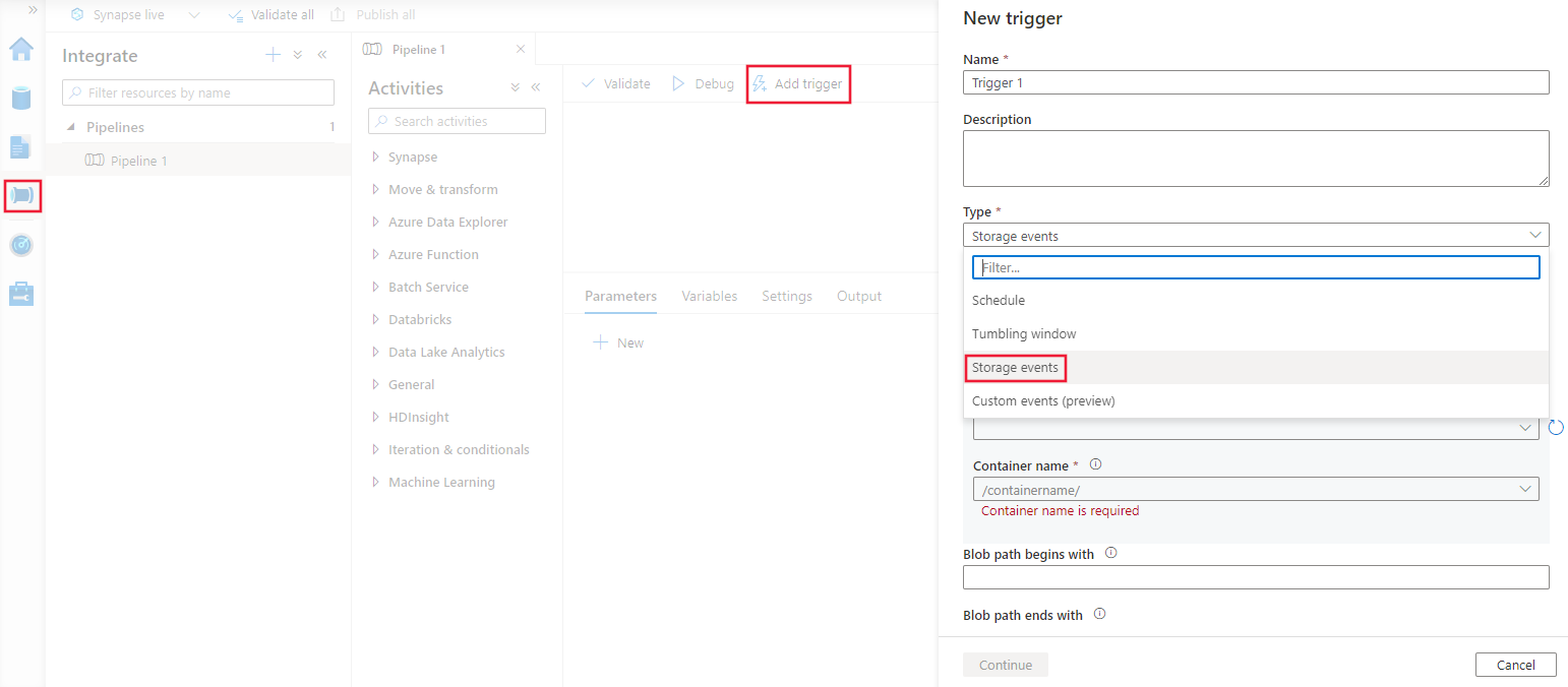 This section shows you how to create a storage event trigger within the Azure Data Factory and Azure Synapse Analytics pipeline user interface (UI).