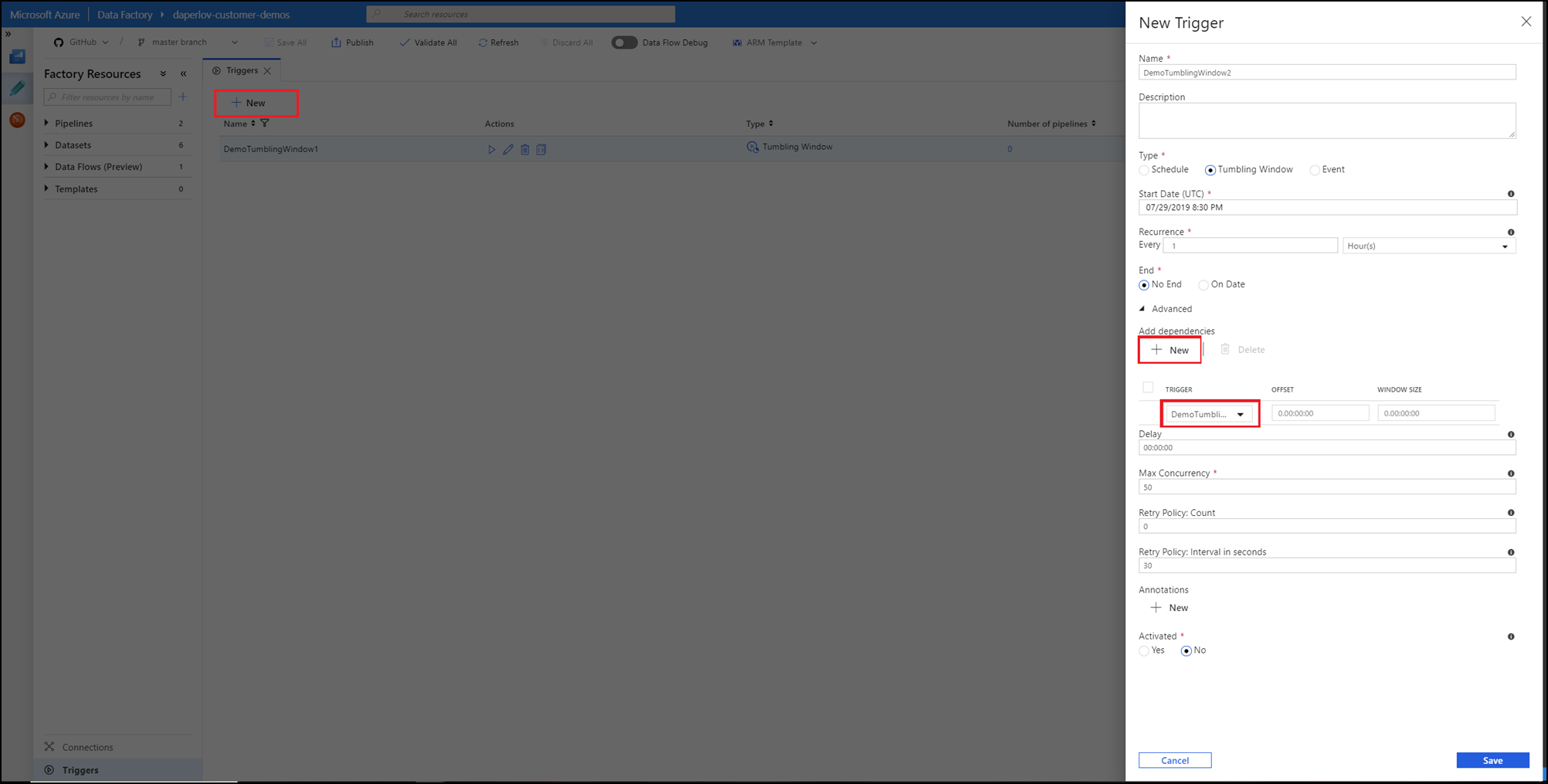 To build a dependency chain and make sure that a trigger is executed only after the successful execution of another trigger within the service, use this advanced feature to create a tumbling window dependency.