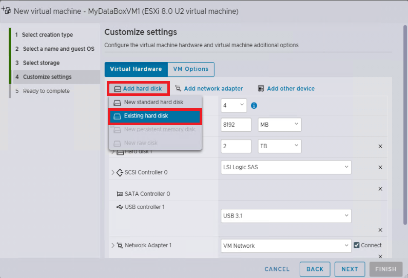 On the same page, select Add hard disk and then select Existing hard disk. Select the VMDK file in the datastore to add an OS disk.