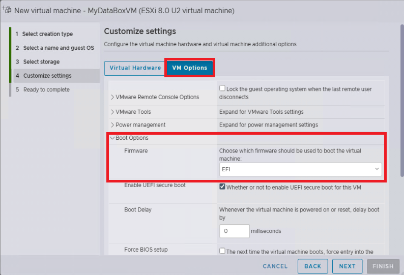 On the Customize settings page, select VM options. Expand Boot options. Ensure that the Firmware field's drop-down list value is set to EFI for ESXi 7.0 or 8.0. Select Next.