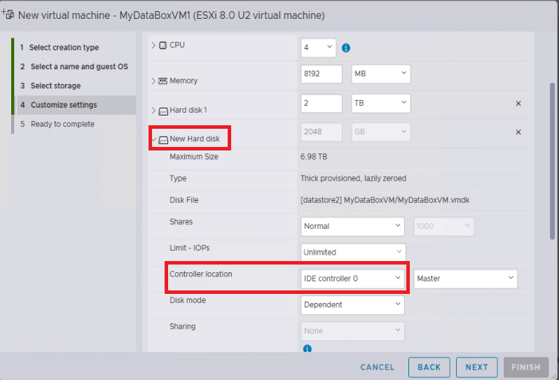 Scroll toward the bottom until you see the New hard disk and expand it to view the settings. Set the Virtual Device Node to IDE controller 0.