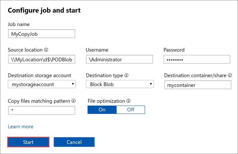 Field Value Job name A unique name fewer than 230 characters for the job. These characters aren't allowed in the job name: <, >, |, ?, *, \, :, /, and \. Source location Provide the SMB path to the data source in the format: \\<ServerIPAddress>\<ShareName>or\\<ServerName>\<ShareName>.Username Username in \\<DomainName><UserName>format to access the data source. Local administrators require explicit security permissions. Right-click the folder, select Properties, and then select Security to add the local administrator within the Security tab.Password Password to access the data source. Destination storage account Select the target storage account to upload data to from the list. Destination type Select the target storage type from the list: Block Blob, Page Blob, Azure Files, or Block Blob (Archive). Destination container/share Enter the name of the container or share that you want to upload data to in your destination storage account. The name can be a share name or a container name. For example, use myshareormycontainer. You can also enter the name in the formatsharename\directory_nameorcontainername\virtual_directory_name.Copy files matching pattern You can enter the file-name matching pattern in the following two ways: - Use wildcard expressions: Only
