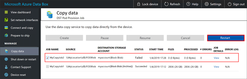 If you experience a failure and can't restart the job, download the error logs and locate the underlying failure. After correcting the issue, create a new job to copy the files. Alternatively, you can also copy the files over SMB.