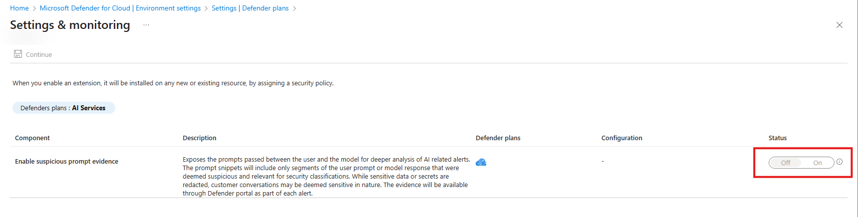 With the AI services threat protection plan enabled, you can control whether alerts include suspicious segments directly from your user's prompts, or the model responses from your AI applications or resources. Enabling user prompt evidence helps you triage, classify alerts and your user's intentions.