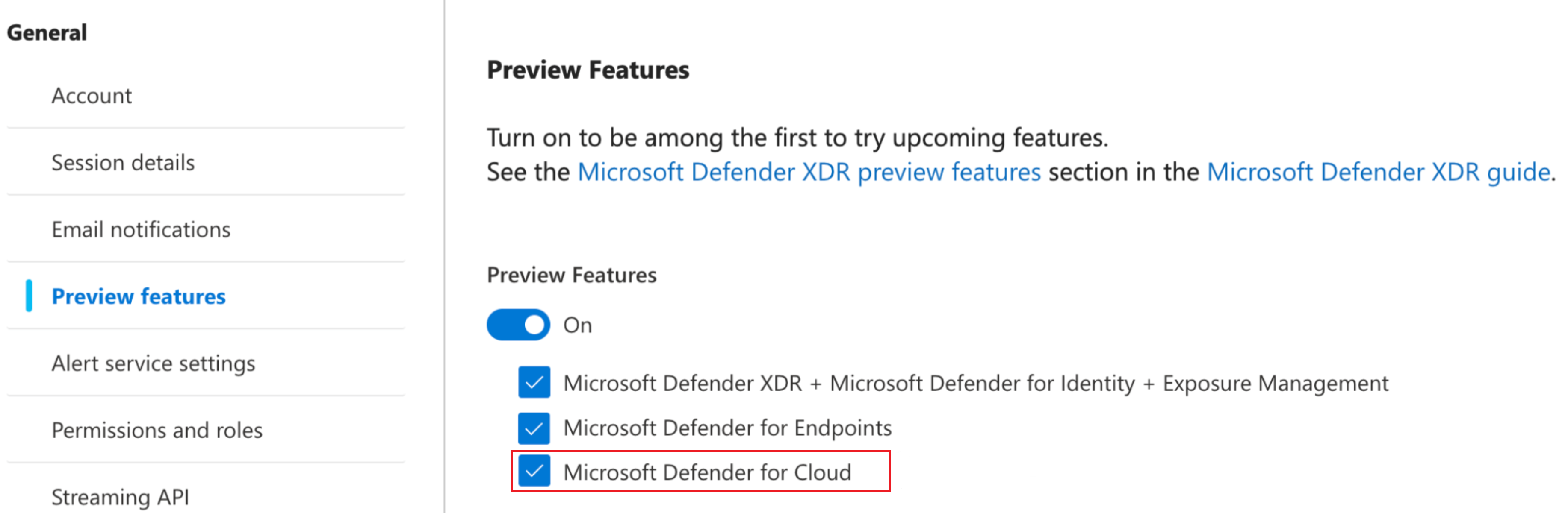 To view preview features in the Defender portal, you need to enable Microsoft Defender for Cloud preview features in the Defender portal..
