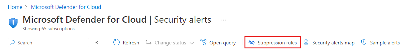 From Defender for Cloud's security alerts page, select Suppression rules at the top of the page.