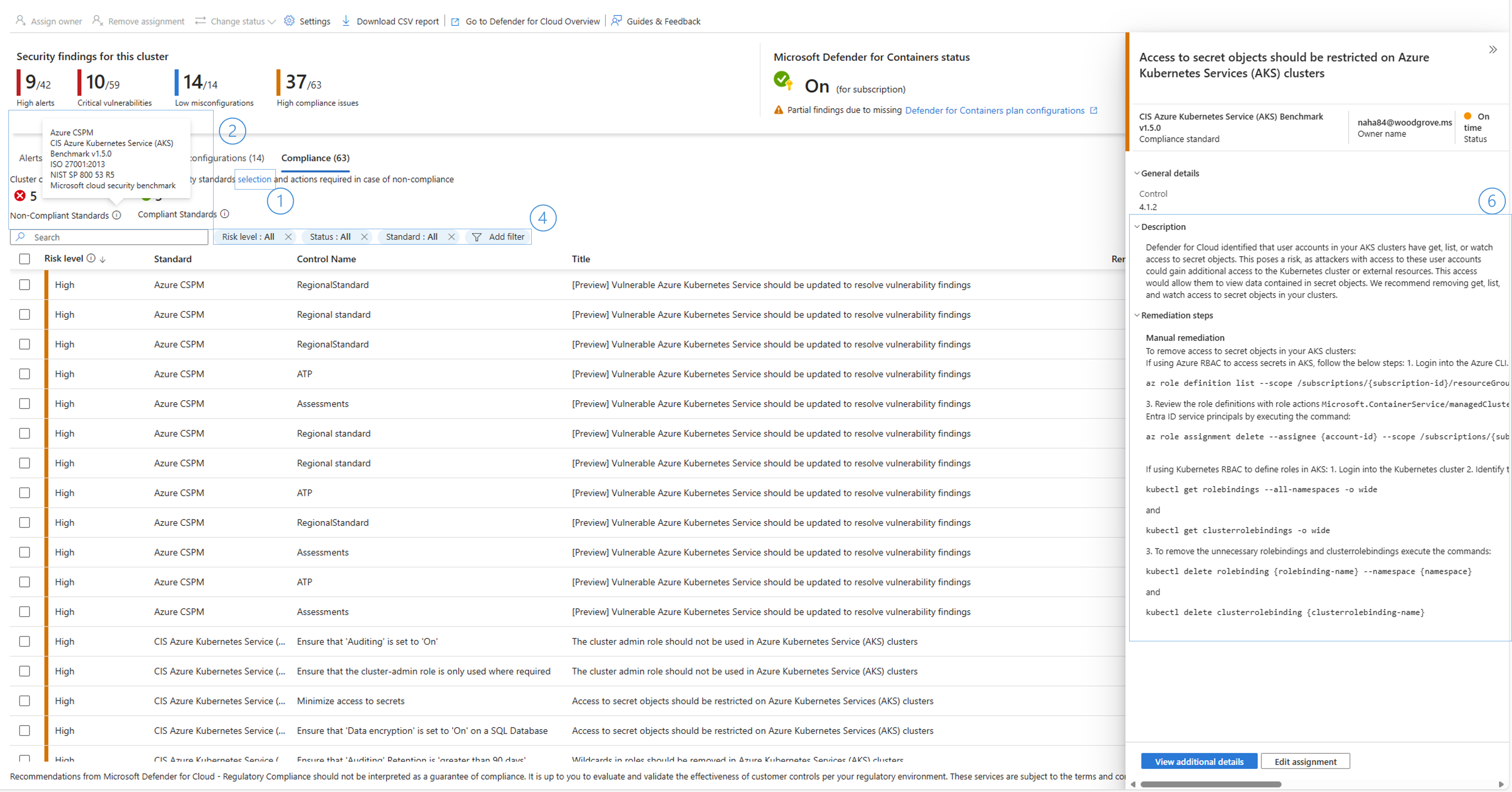 Select Download CSV report to download the cluster security findings as a CSV file. You can also use the Defender for Cloud REST API to retrieve security findings.