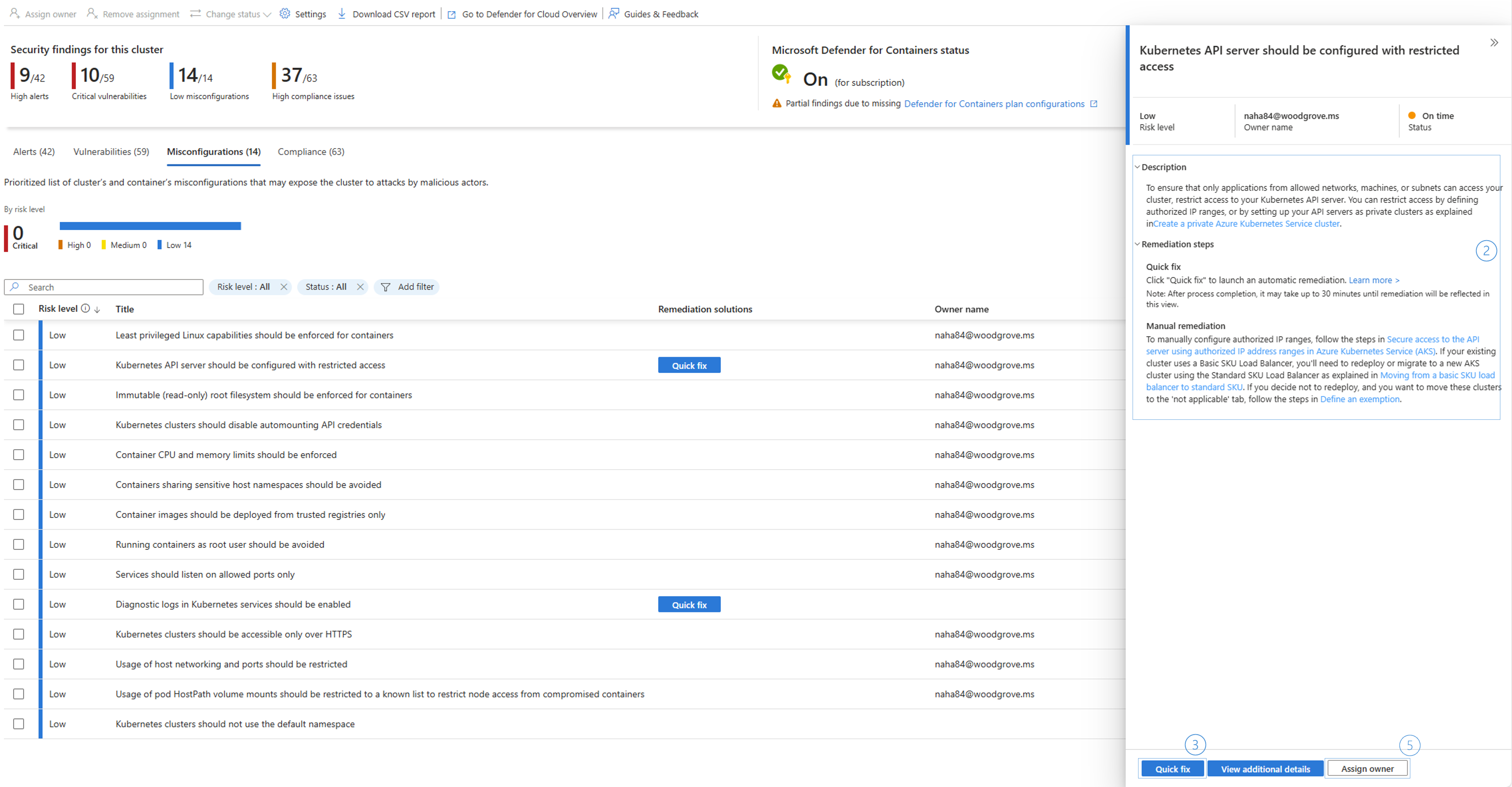 For cluster level misconfigurations, use the Quick Fix button to start remediation flow.