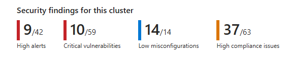 The top findings bar shows the security status of the cluster. For each findings type, it shows the number of the highest severity or risk issues. Use the top findings to decide whether to check the different tabs for further investigation.