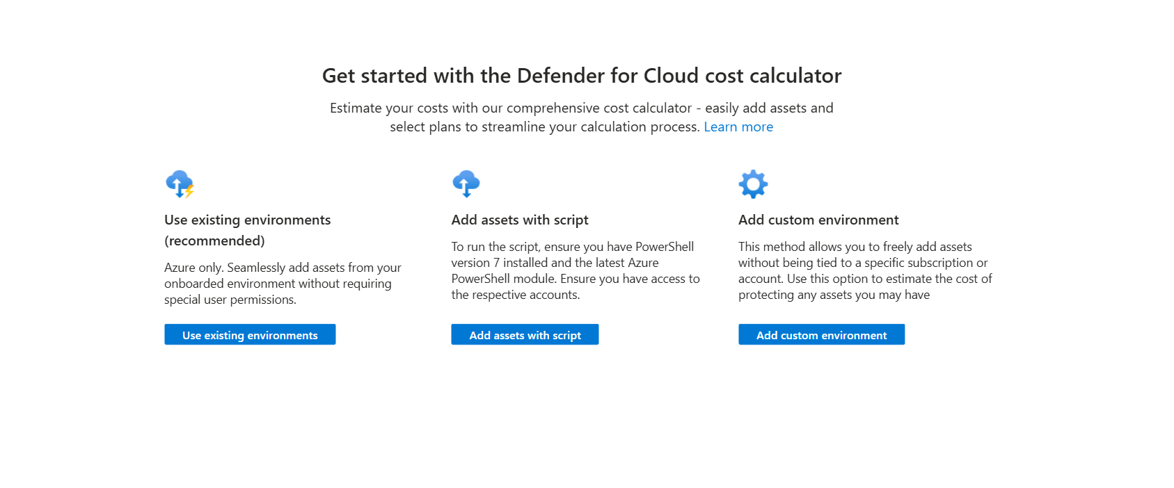 On the first page of the calculator, select the Add Assets button to start adding assets to your cost calculation. You have three methods to add assets: