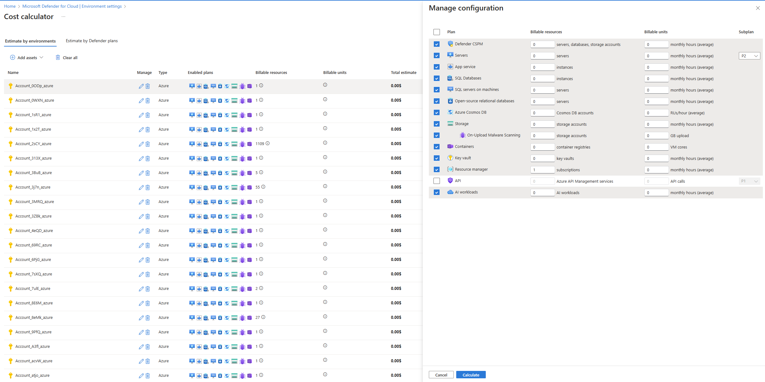 - For Defender for APIs: When calculating the cost based on the number of API calls in the last 30 days, we automatically select the best Defender for APIs plan for you. If there are no API calls in the last 30 days, we automatically disable the plan for calculation purposes.