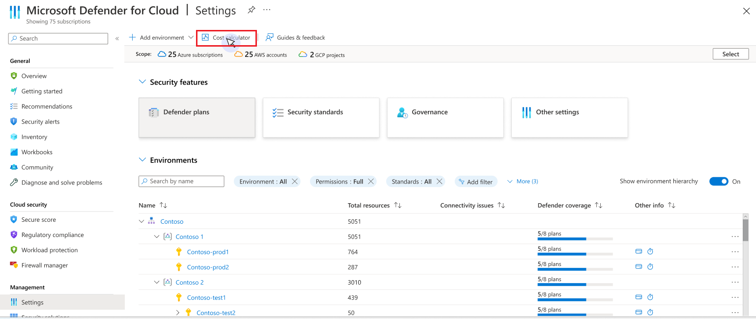 Try the new cost calculator and see its benefits. Access the tool and start defining the scope of your protection needs. To use the Defender for Cloud Cost Calculator, go to the Microsoft Defender for Cloud Environment settings and select the Cost Calculator button.