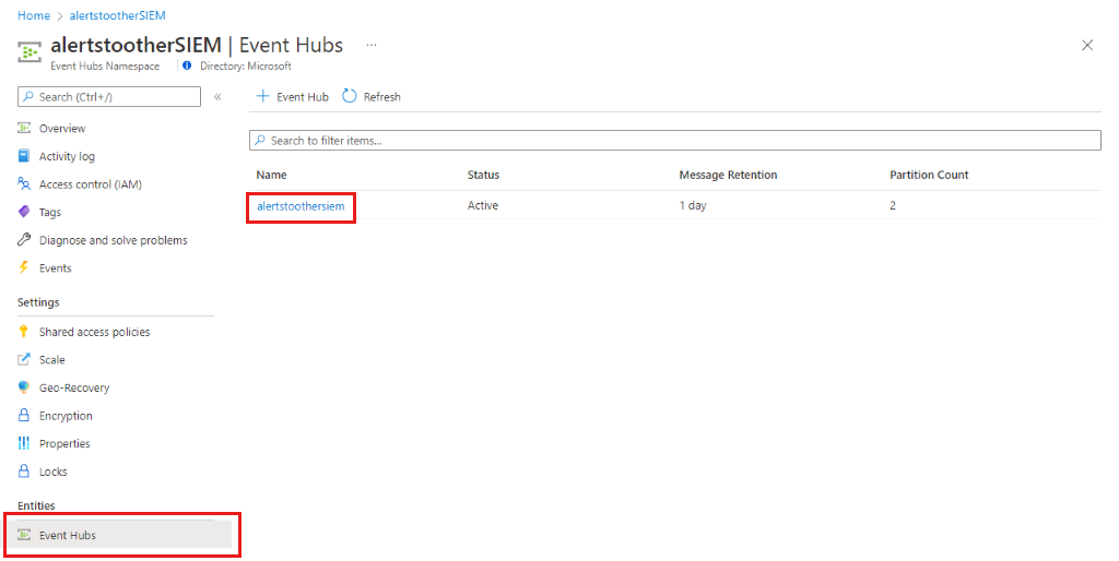 In the Entities section of the Event Hubs event hub menu, select Event Hubs and select the event hub you created.