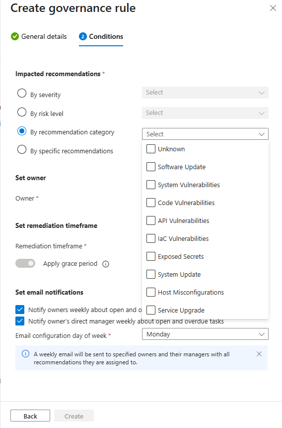 • By severity: The rule assigns the owner and due date to any recommendation in the subscription that has no owner or due date and that matches the specified severity levels.