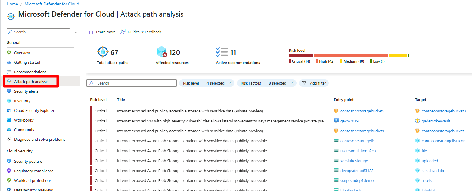 By default attack paths are organized by risk level. The risk level is determined by a context-aware risk-prioritization engine that considers the risk factors of each resource. Learn more about how Defender for Cloud prioritizes security recommendations.