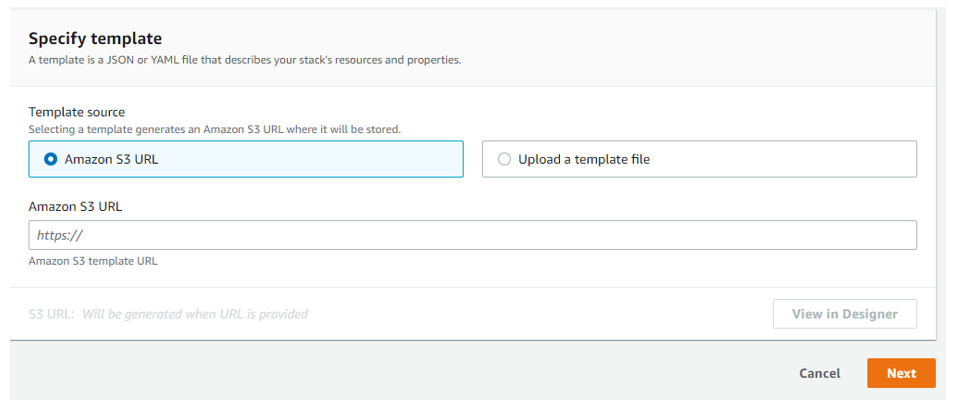 Amazon S3 URL: Upload the downloaded CloudFormation template to your own S3 bucket with your own security configurations. Enter the URL to the S3 bucket in the AWS deployment wizard.