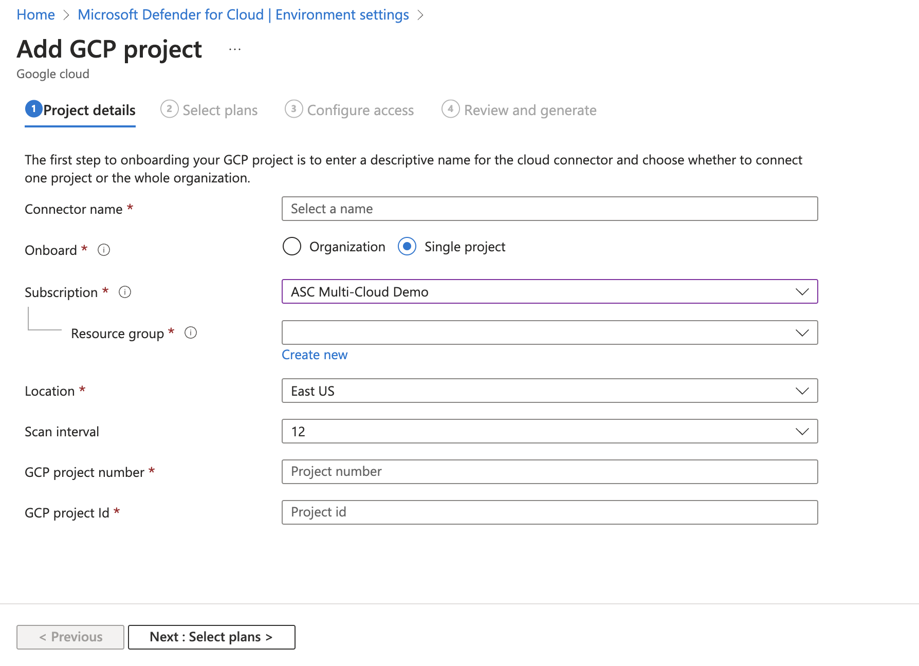 Once you selected the plans, you want to enable and the resources you want to protect you have to configure access between Defender for Cloud and your GCP organization.