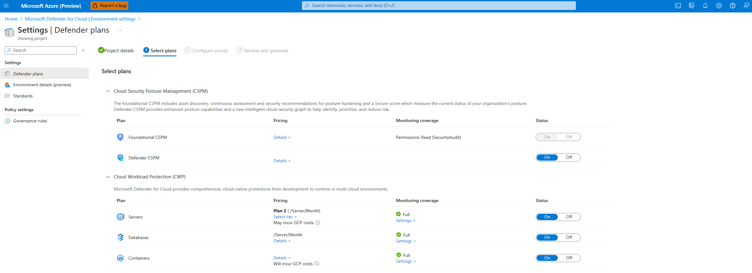 Once you selected the plans, you want to enable and the resources you want to protect you have to configure access between Defender for Cloud and your GCP project.